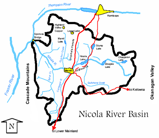 The biodiversity found within the watershed presents difficult challenges for land use planning and resource management. The Nicola watershed is an area that encompasses some 728,000 hectares (1.8 million acres). Its western boundaries reach to Spences Bridge; take in Logan Lake and Stump Lake at its northern end; extend a few kilometres past Pennask Lake to the east and Brookmere to the south. There are two main rivers - the Nicola and Coldwater - within its boundaries, which link or are connected to numerous lakes, streams and creeks. The largest lakes are the Nicola, Pennask, Douglas and Stump.