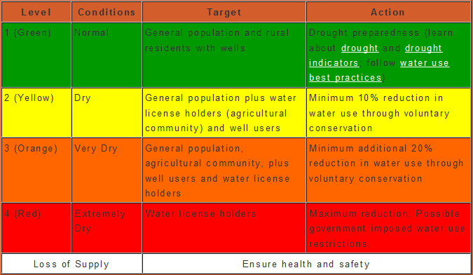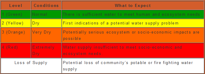 In order to manage drought conditions of varying severity, the BC provincial government has adopted a rating system of four successive levels of drought.